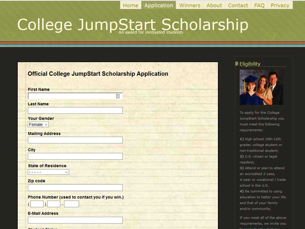 The College JumpStart Scholarship is an annual, merit-based competition -- financial need is not considered -- that is open to 10th-12th graders, college students and non-traditional students. The main requirement is that you are committed to going to school and can express your goals for g